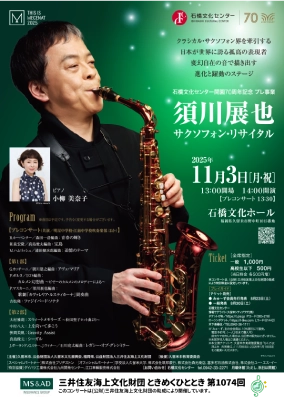 11月3日 石橋文化センター開園70周年記念プレ事業 三井住友海上文化財団 ときめくひととき 第1074回「須川展也サクソフォン・リサイタル」